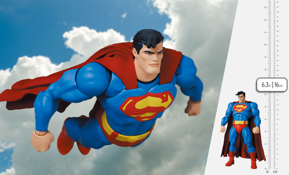 The superman statue has a sculpted blue costume with textured elements and red and yellow accents, including the beautifully crafted iconic red cape. Made with a great attention to details.. Made with a great attention to details.